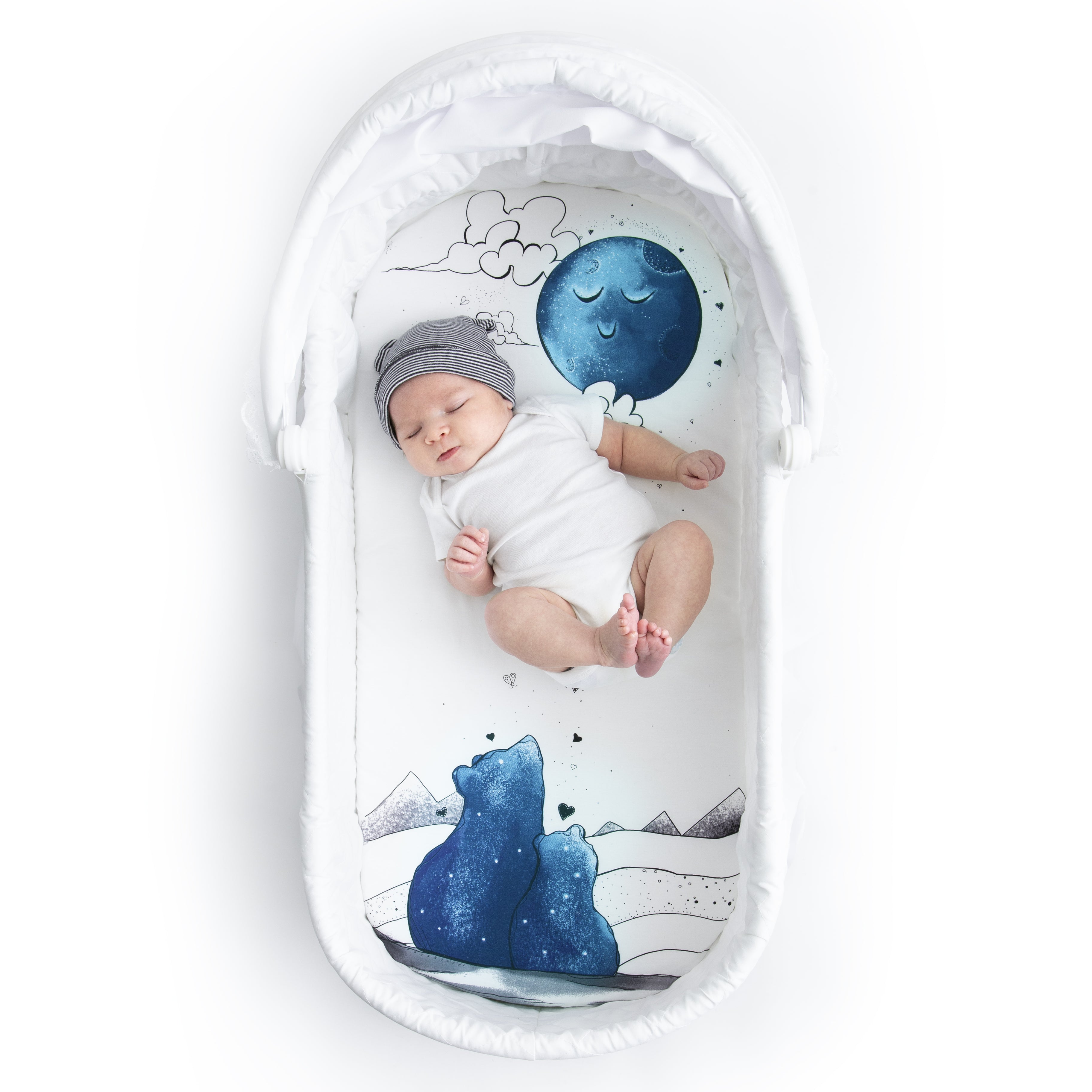 Color: Mama BLue Bear - Designed by parents for, the super soft JumpOff Jo Mama Bear Blue Bassinet Sheet is sure to put a smile on your baby’s face. The original design illustrates your love for your little one all the way to the moon and back. The hues of blue, black, and white are an adorable addition to any nursery or bedroom. Fabric Care Details