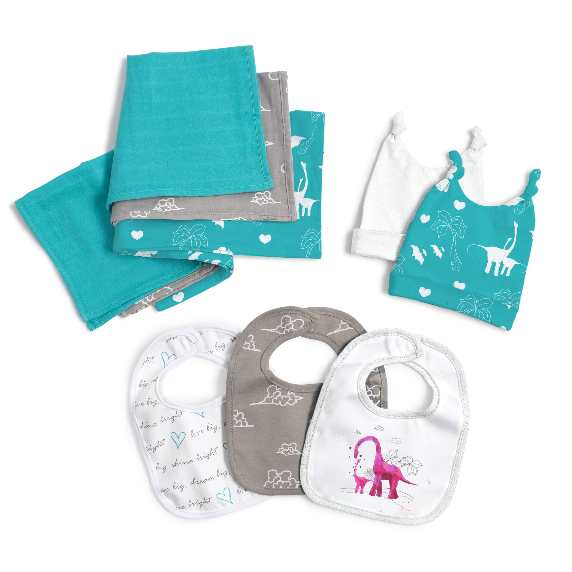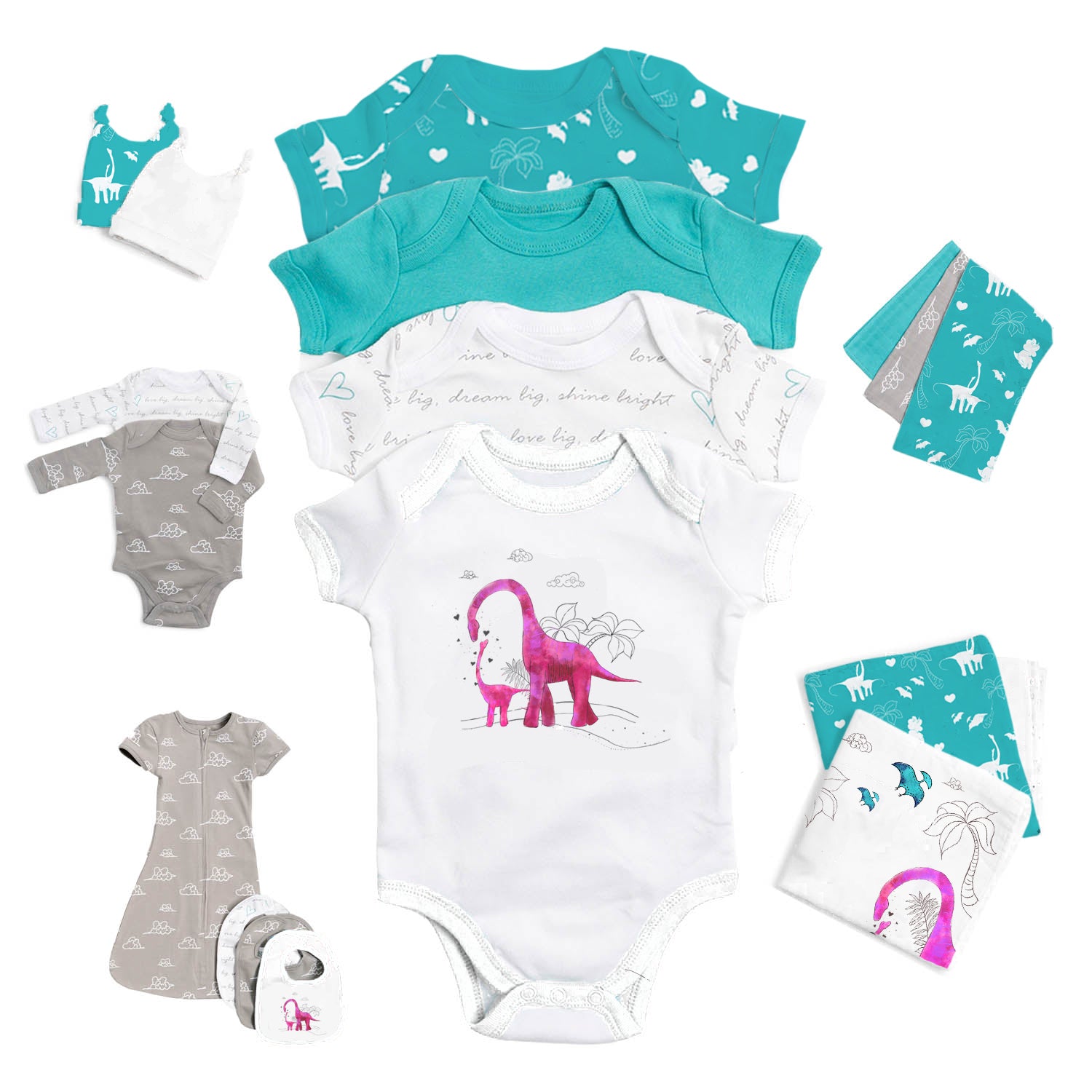 ADORABLE DESIGNS – This large baby layette set contains a mixture of complementary solid, patterned, and graphic designs, including our original dinosaur art in pink and turquoise accent colors. Your little munchkin will look good and feel good in the soft cotton clothing.