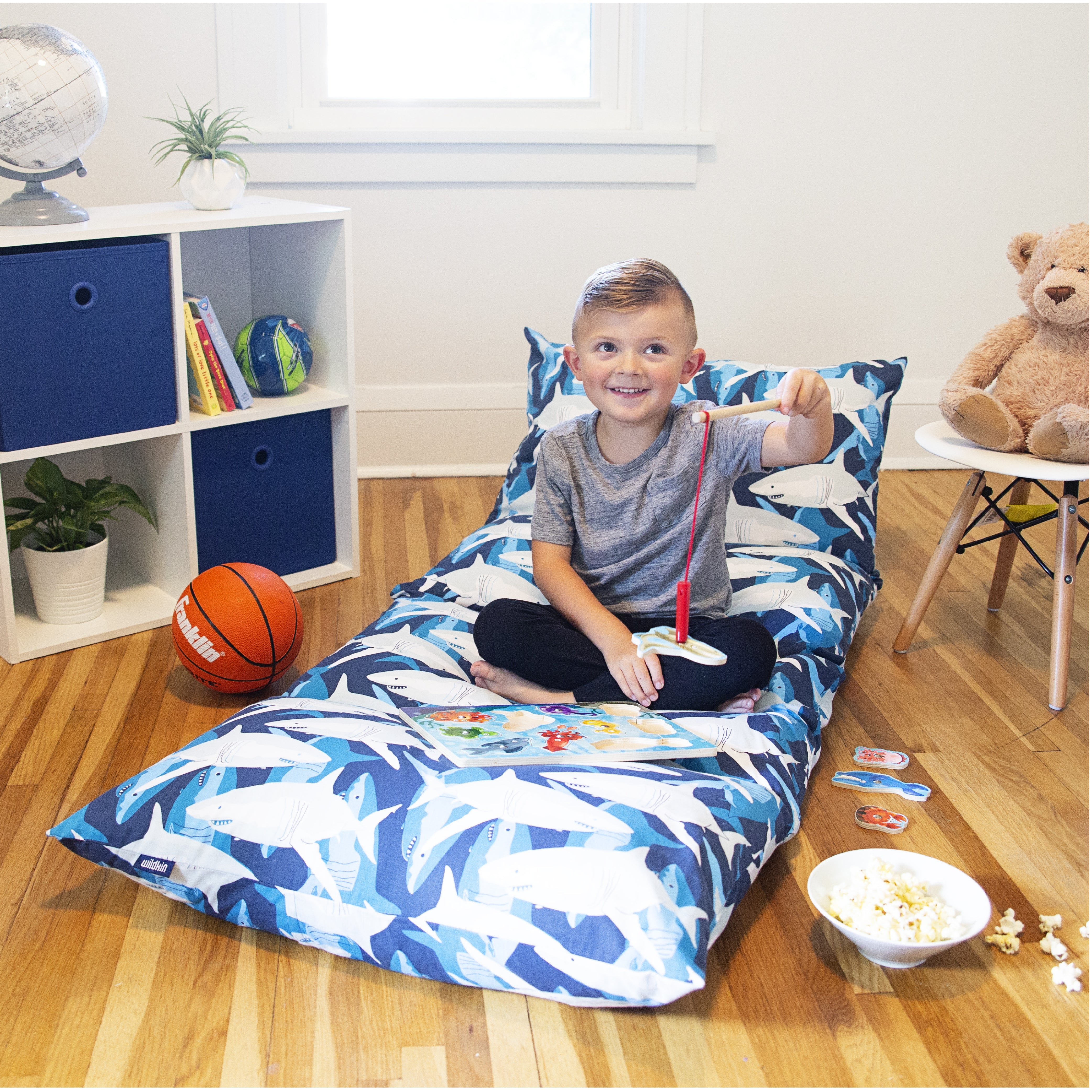 Sit back and relax with Wildkin’s Sharks in blue ultra-comfy pillow lounger for boys and girls! This lounger is perfect for sleepovers, weekends at grandma’s, or snuggling up with a good book. Insert your own pillows and fold the top pillow under to create a head rest or lay it flat to use it as a pillow bed. Each pillow lounger is made from a super soft blend of cotton and polyester materials and features your child’s favorite vibrant, playful patterns.