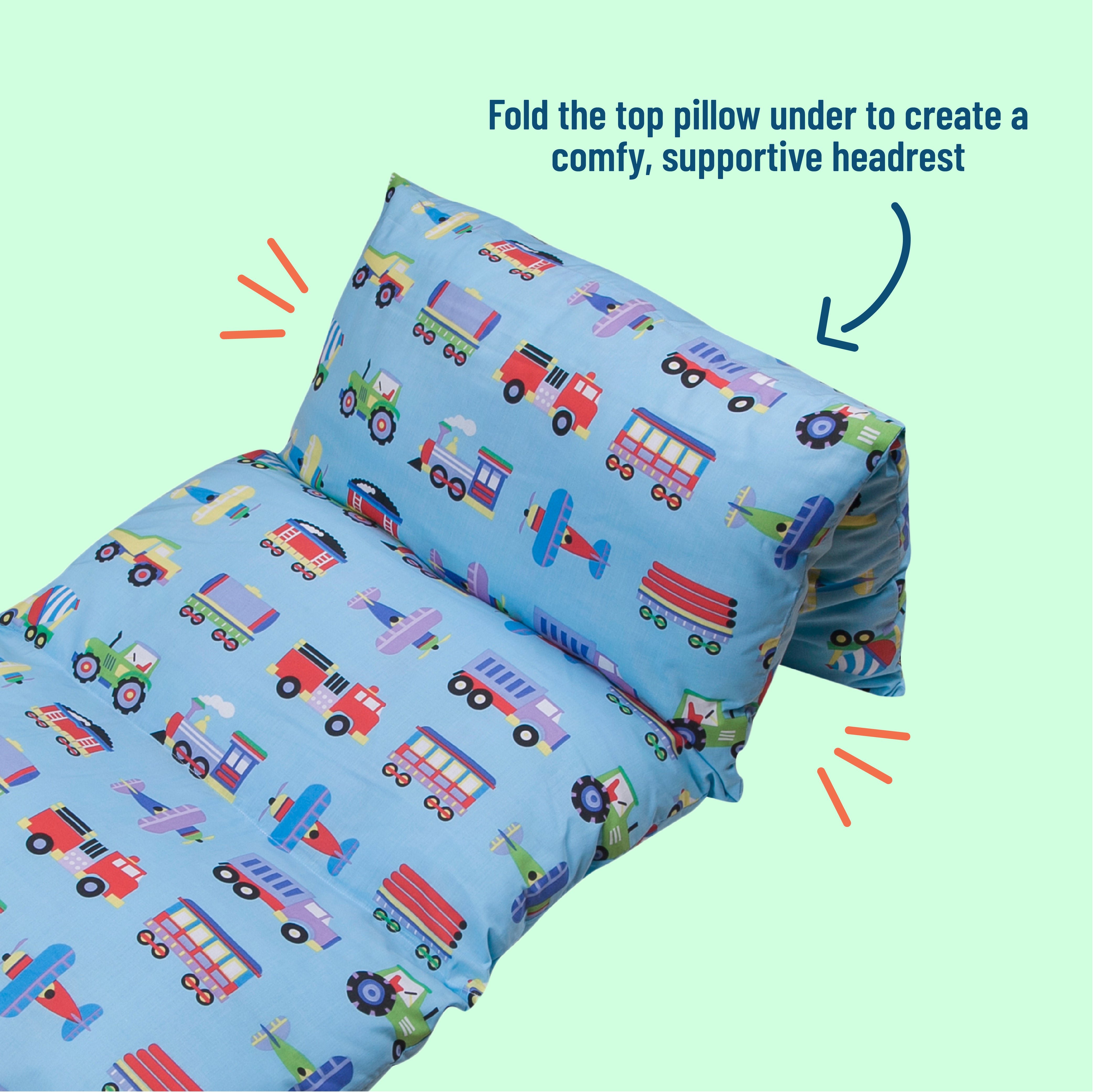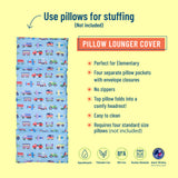Sit back and relax with Wildkin’s Trains, Planes & Trucks in blue ultra-comfy pillow lounger for boys and girls! This lounger is perfect for sleepovers, weekends at grandma’s, or snuggling up with a good book. Insert your own pillows and fold the top pillow under to create a head rest or lay it flat to use it as a pillow bed. Each pillow lounger is made from a super soft blend of cotton and polyester materials and features your child’s favorite vibrant, playful patterns.